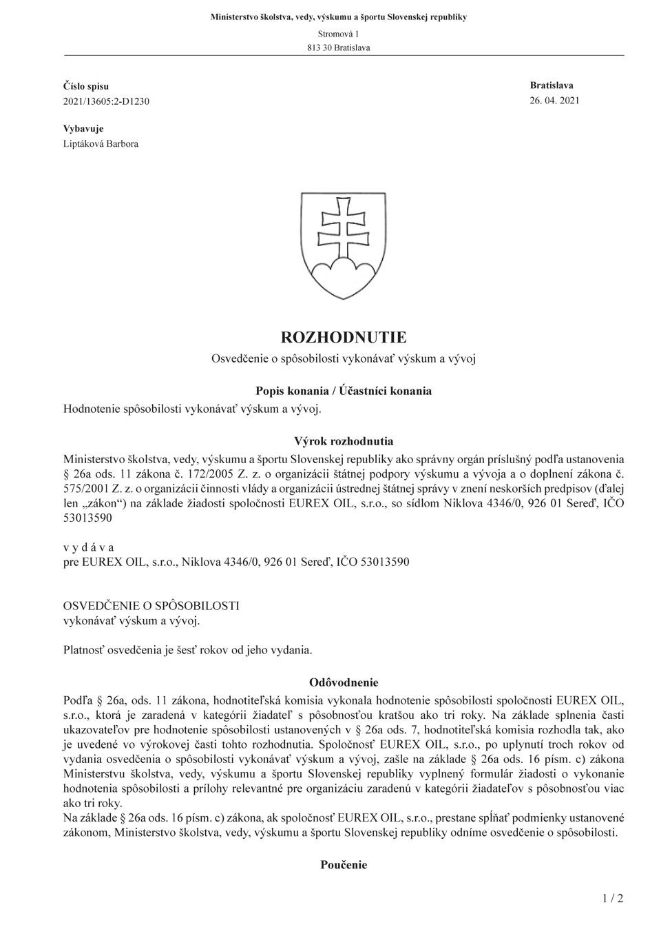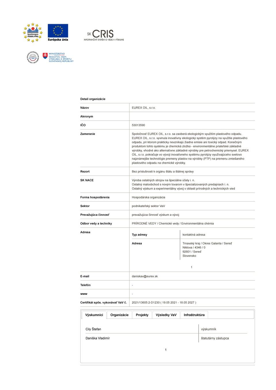Eurex Energy, s.r.o. capitalized on its own development using foreign knowledge and experience in the production of new technology in the use of renewable and alternative energy sources, the EUREX ECO 01 equipment for the recovery of mixed waste plastics in the form of chemical recycling.ed.